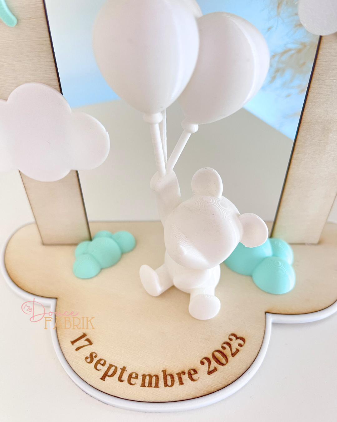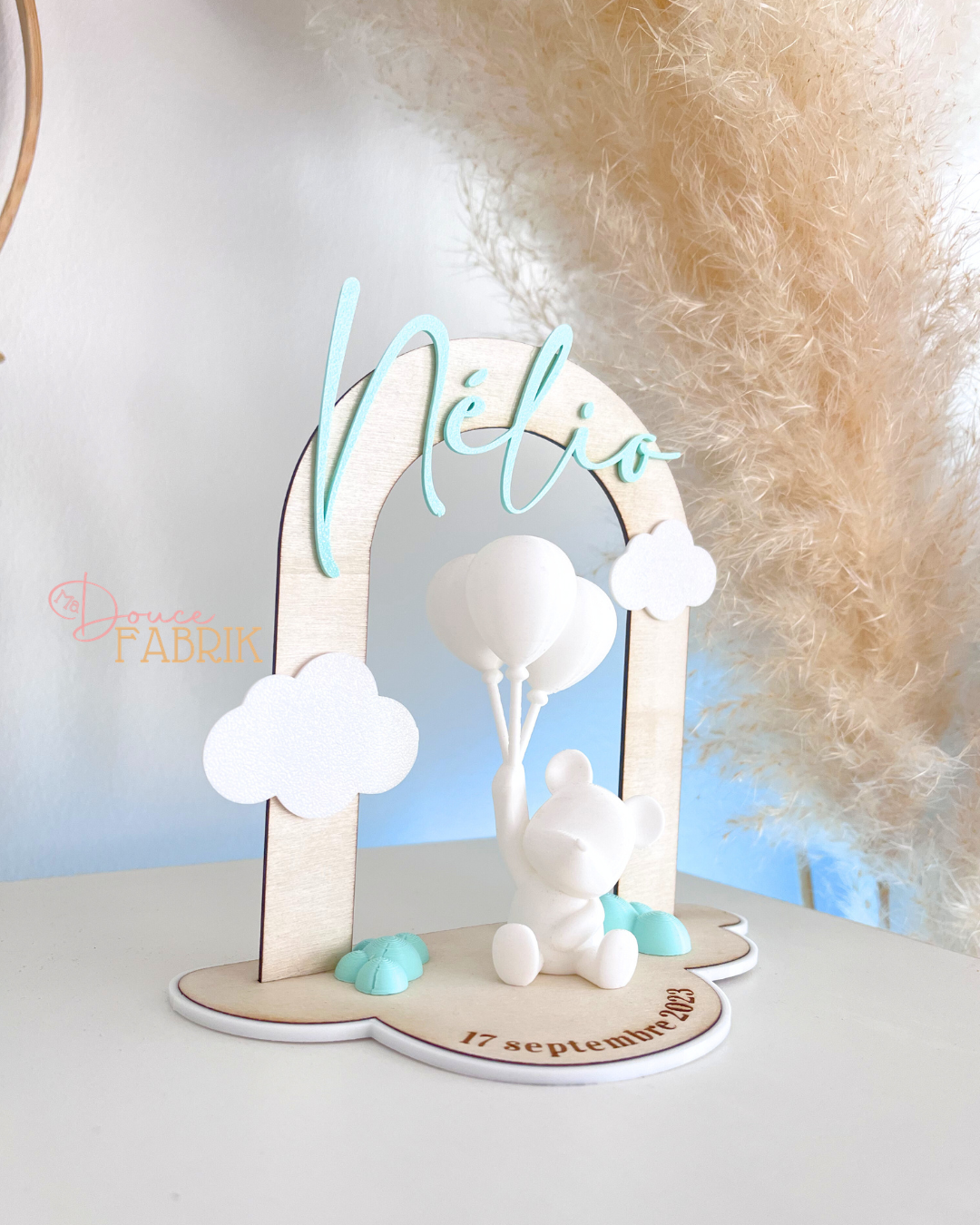 Sous une arche de bois élégante, un petit ourson s’envole avec ses ballons parmi les nuages, créant une scène légère et apaisante. Entièrement personnalisable avec le prénom de l’enfant et une date importante (naissance, baptême, anniversaire), cet objet devient un souvenir précieux à conserver toute la vie.
