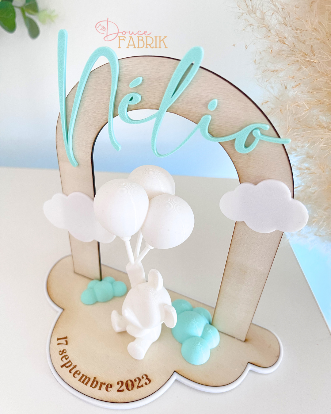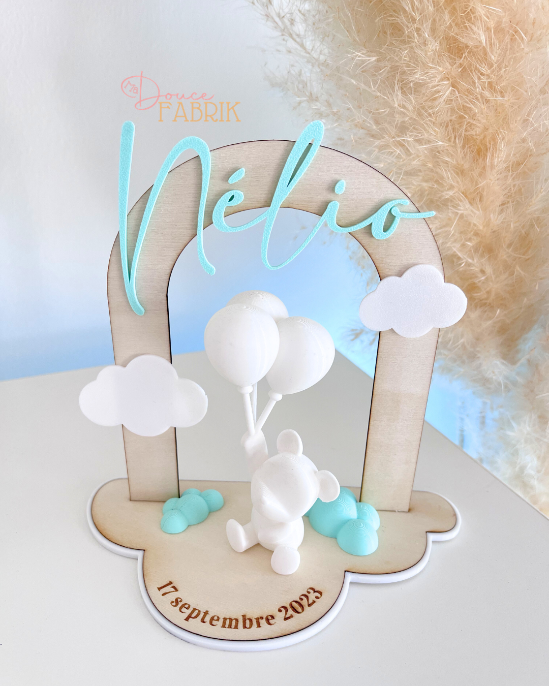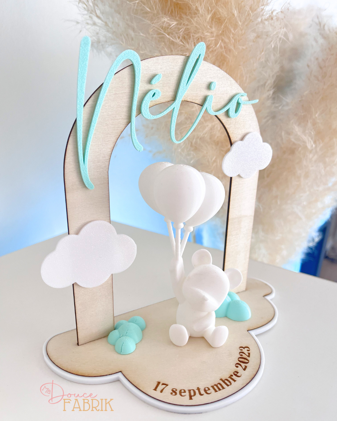 Artisanat mixte : Une alliance moderne entre le bois découpé avec précision et des éléments en impression 3D (ourson, ballons, prénom, nuages).