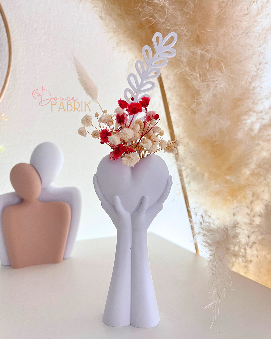 Véritable symbole d’amour et de délicatesse, ce soliflore unique a été conçu pour sublimer vos petits coins de bonheur. Fabriqué avec soin dans notre atelier Ma Douce Fabrik grâce à la technologie de l’impression 3D, ce vase présente un design moderne et épuré : deux mains délicates soutenant un cœur, prêt à accueillir la nature.
