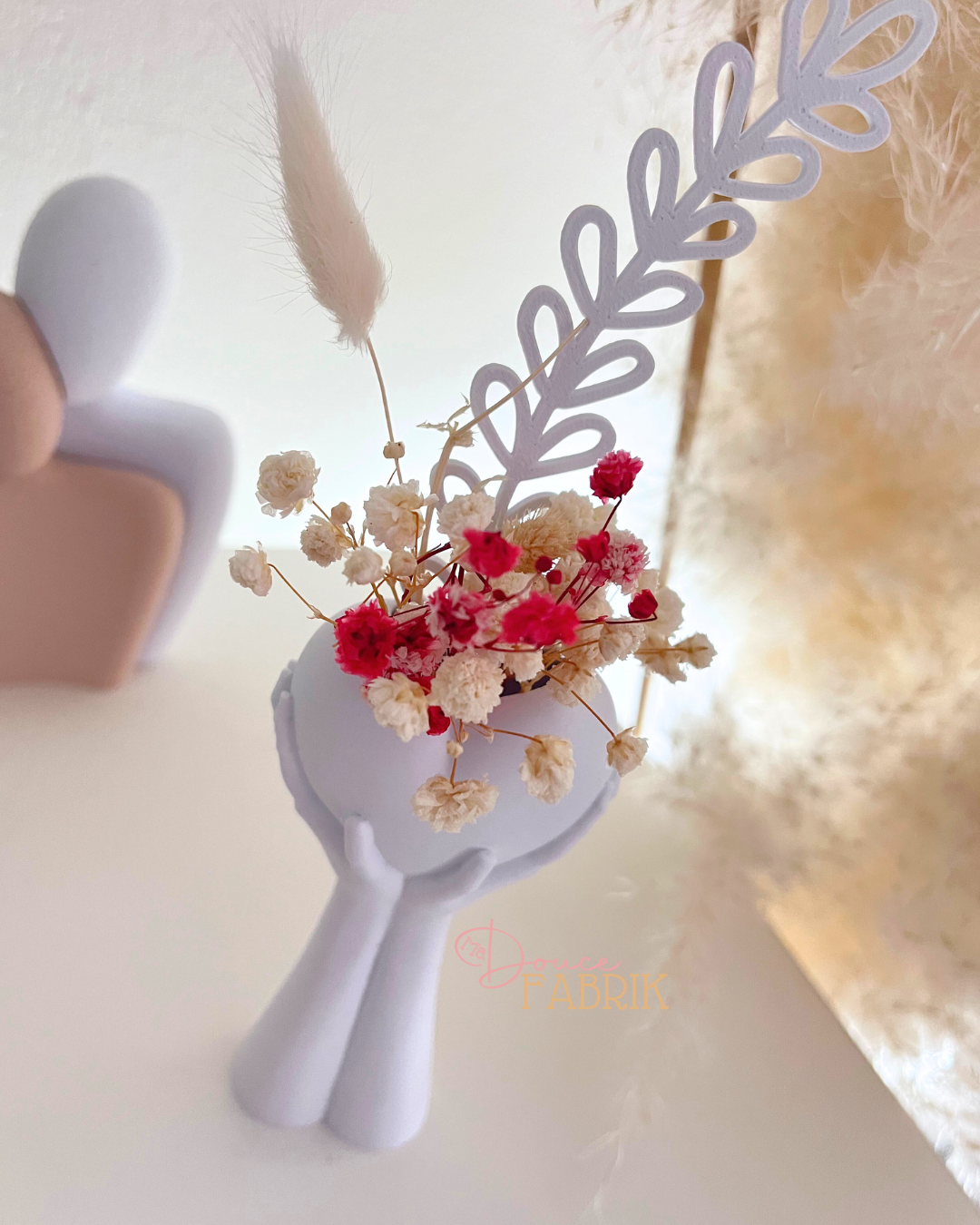 Pour vous faciliter la décoration, ce vase n’arrive pas seul. Il est accompagné d’un bouquet de fleurs séchées aux tons rouges et blancs, ainsi que d’une décoration florale exclusive en impression 3D, apportant une touche graphique et originale qui ne flétrira jamais.