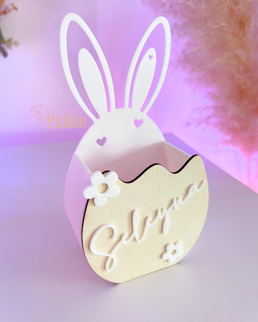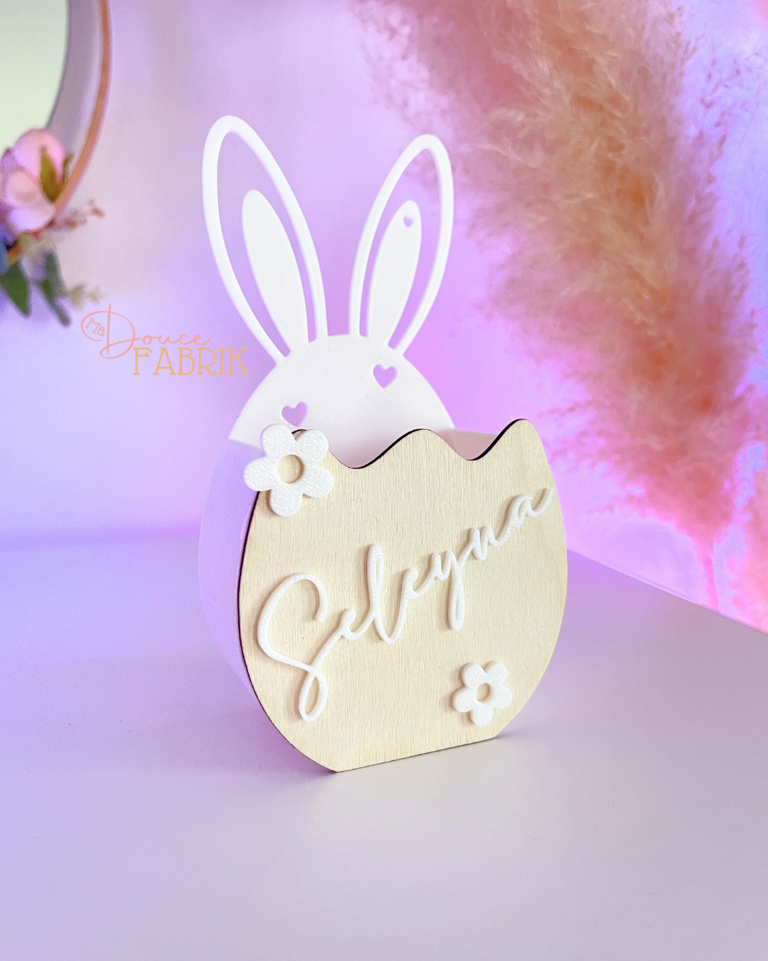 - Personnalisation : Prénom en relief + choix du motif (Marguerite, Œuf, Tête de lapin ou Cœur).