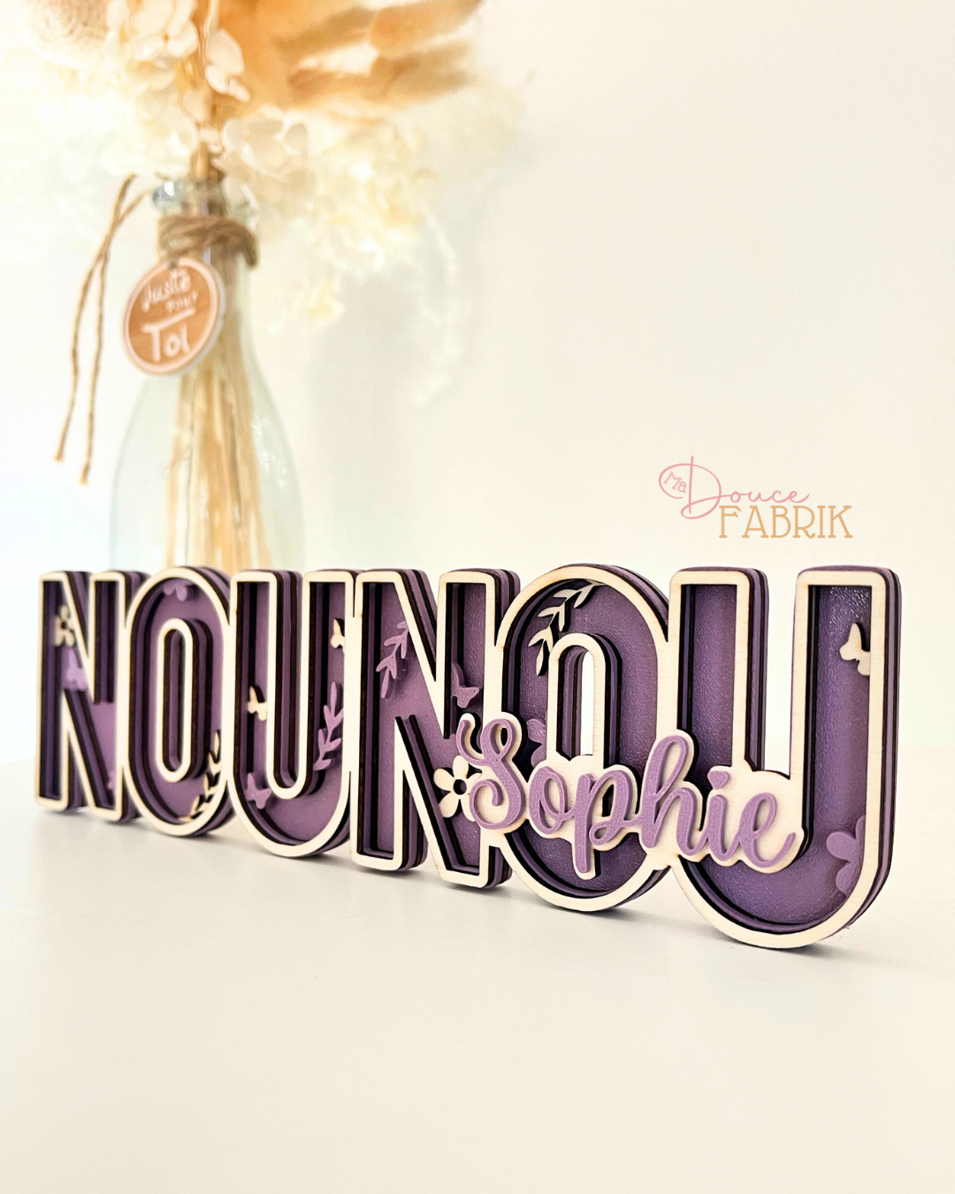 Un design sur mesure : Vous choisissez tout ! Du mot principal mis en avant (Nounou, Maman, Maîtresse, Prénom…) au petit nom qui vient signer l’œuvre.