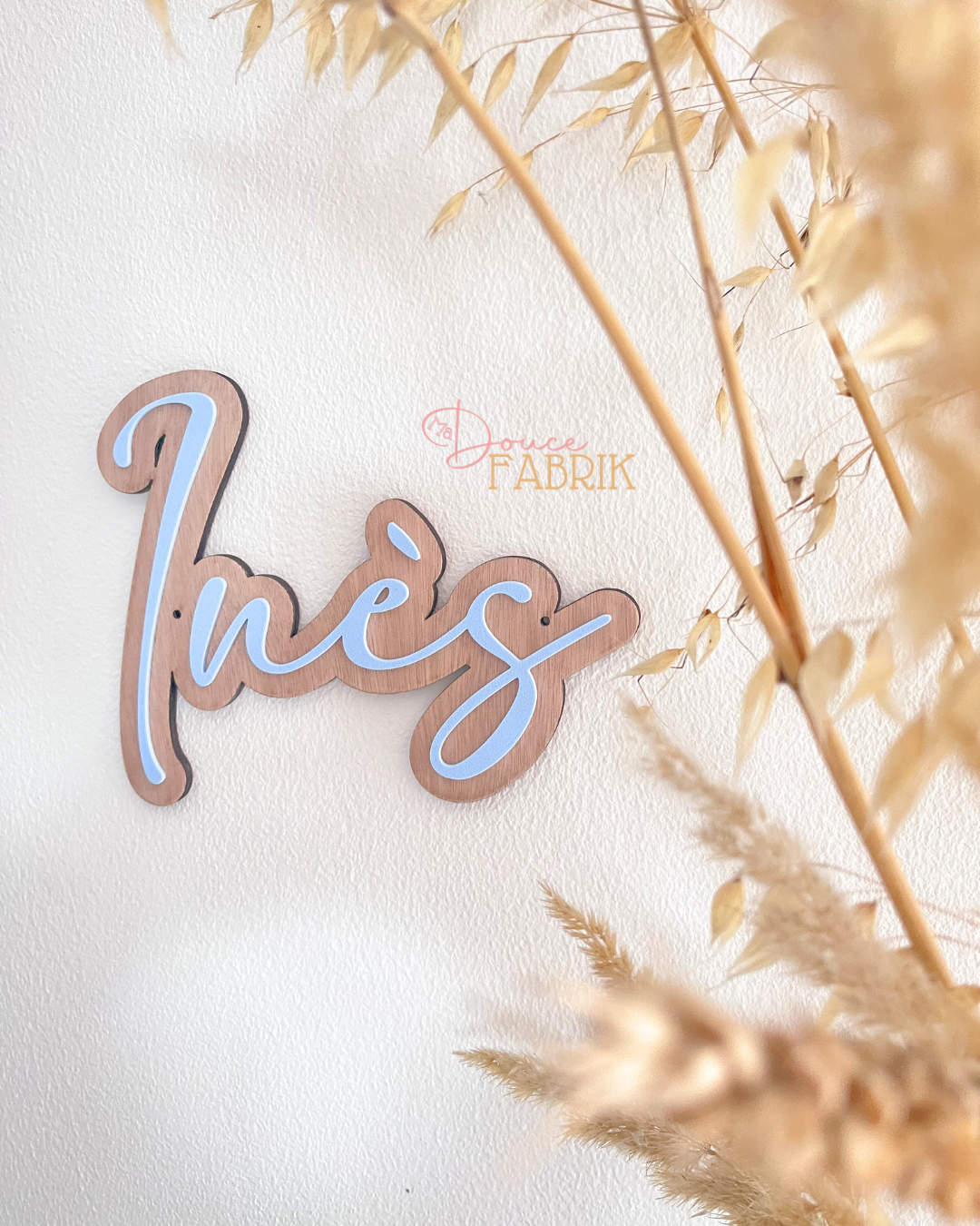 Chaque prénom est conçu avec le plus grand soin. Le support en bois clair est découpé avec une précision laser, créant une silhouette douce qui suit les courbes du prénom. Par-dessus, le prénom lui-même est réalisé en relief, apportant une superbe dimension 3D qui attire le regard et sublime la décoration. Ce jeu de textures et de superpositions en fait un objet aussi beau à regarder qu’à toucher.