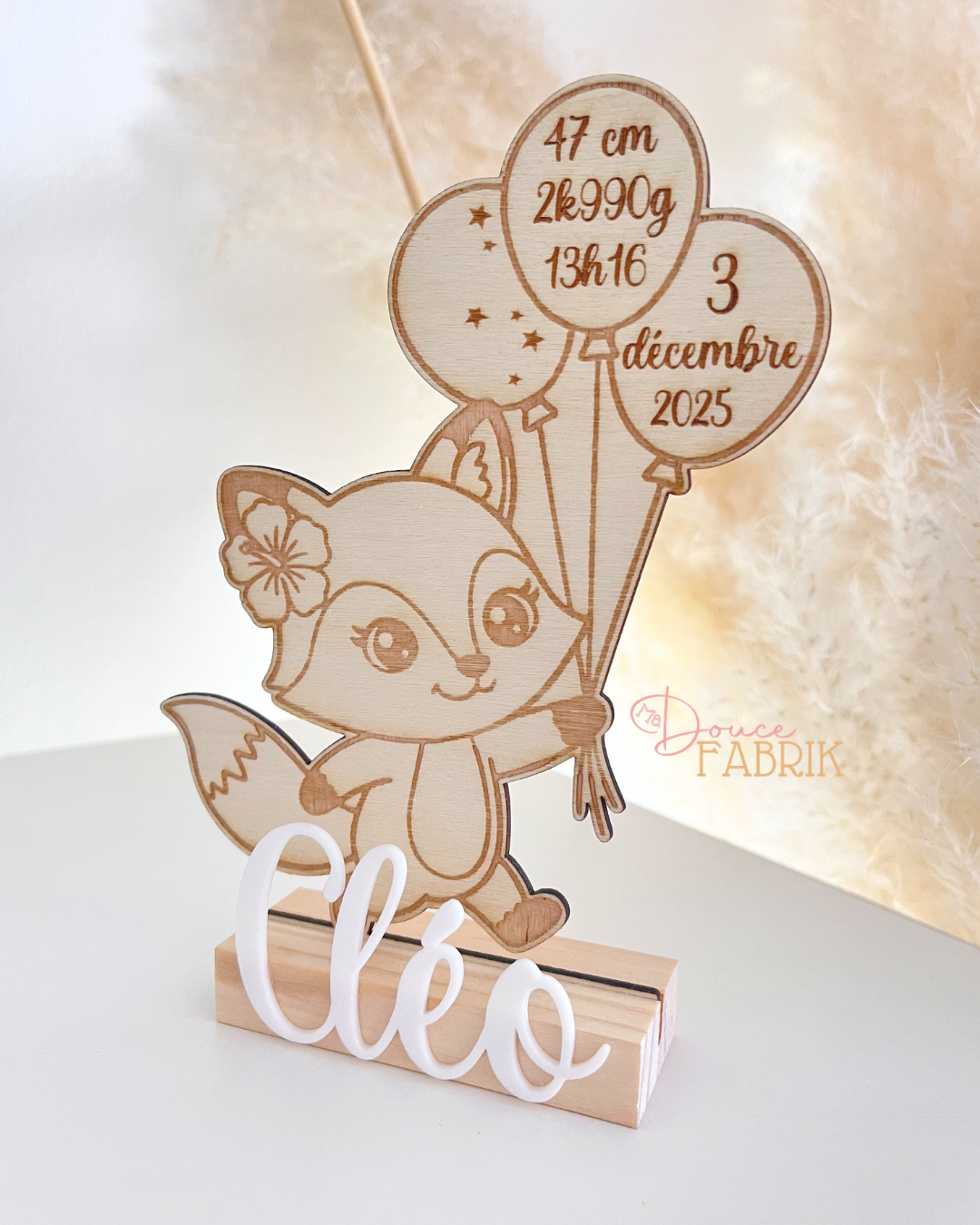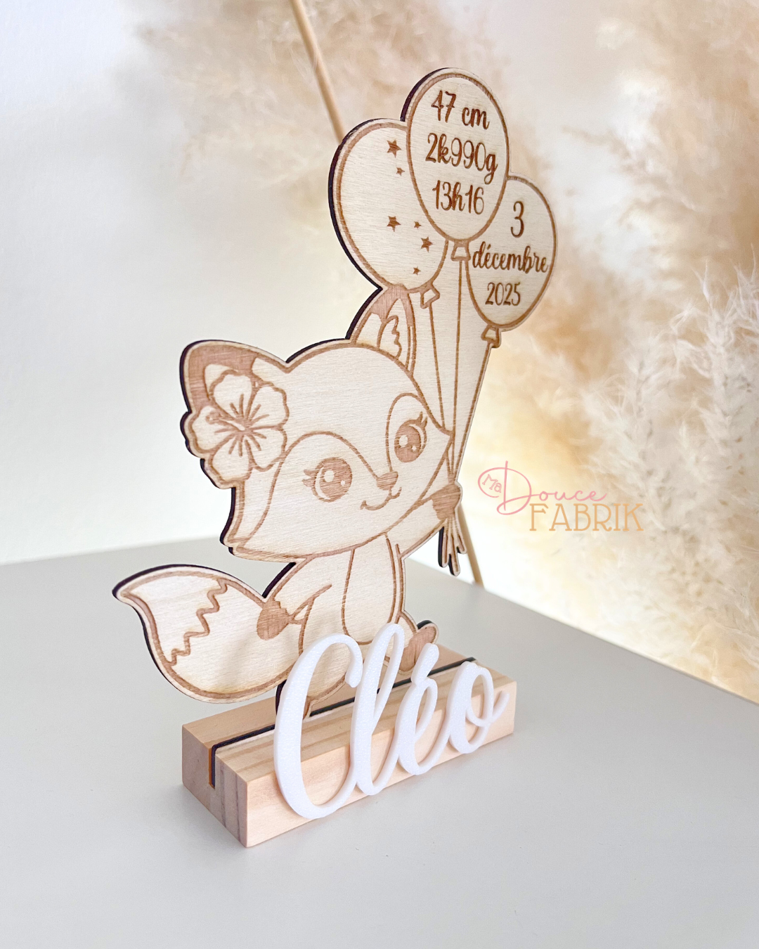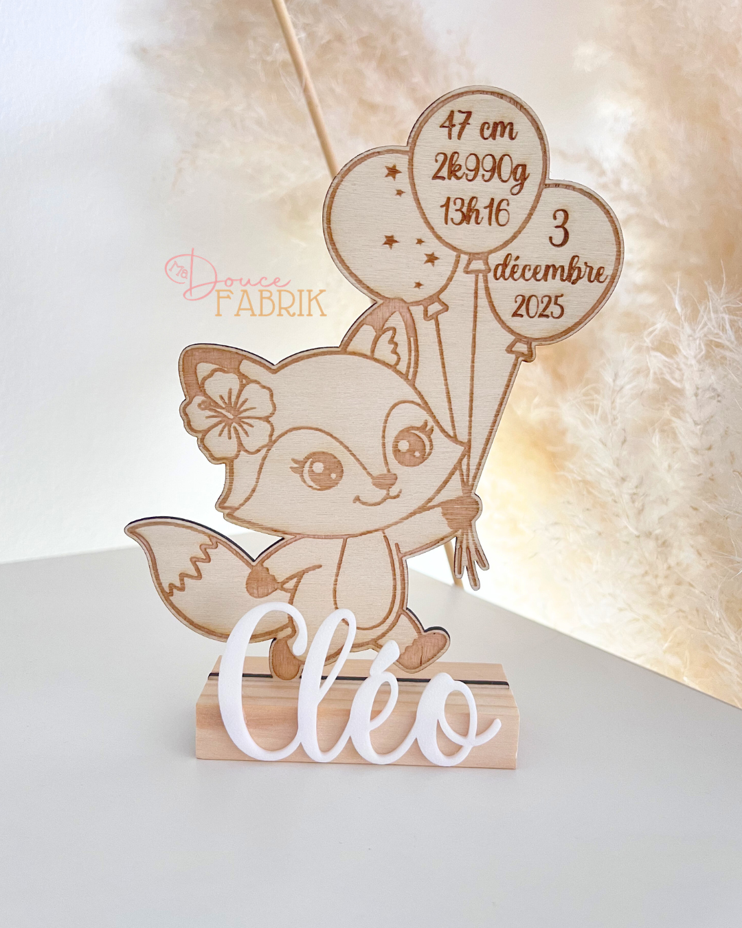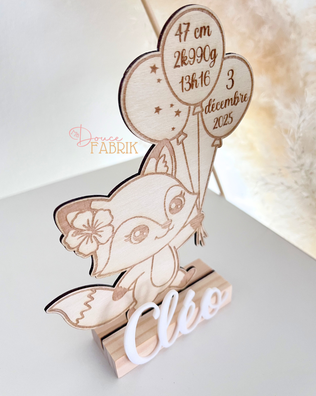 Immortalisez le plus beau jour de votre vie avec notre adorable décoration de naissance en bois personnalisée. Ce charmant renard, tenant fièrement ses ballons souvenirs, est le cadeau parfait pour célébrer l’arrivée d’un nouveau-né et pour décorer sa chambre avec tendresse.
