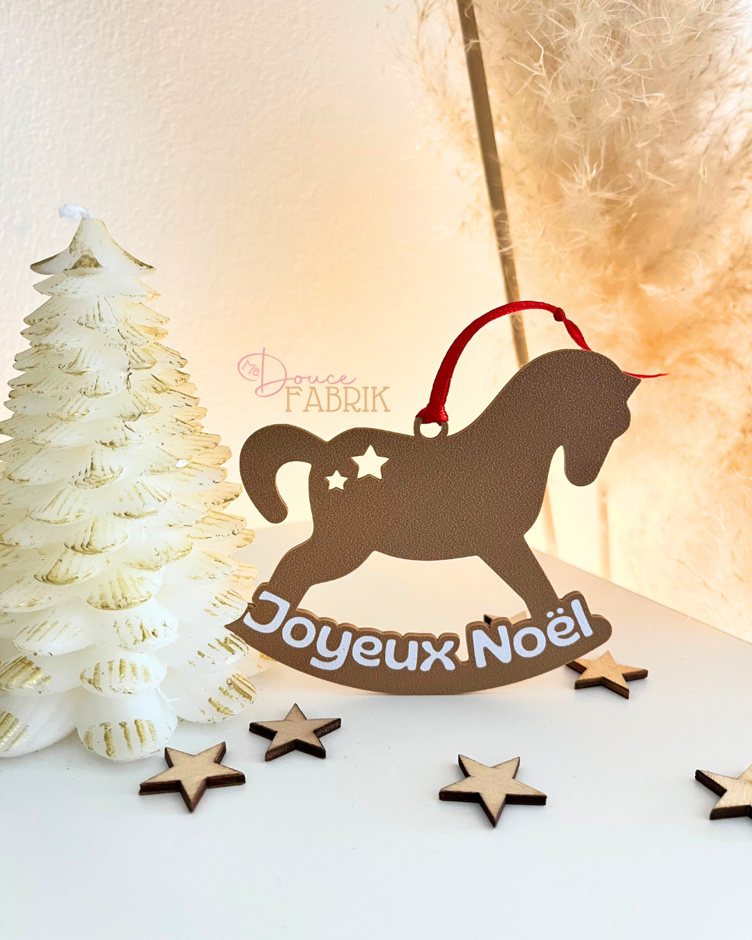 Ajoutez une touche magique à vos fêtes avec notre adorable suspension de Noël en impression 3D, représentant un charmant cheval à bascule.