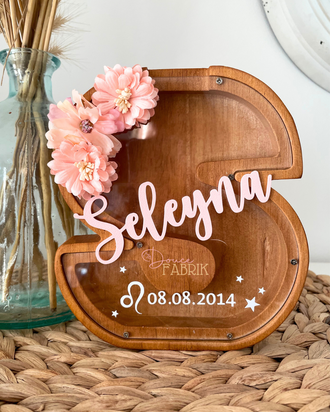 Tirelire Lettre en Bois Personnalisée « Fleurie » – Prénom 3D, Cadeau de Naissance & Anniversaire Unique